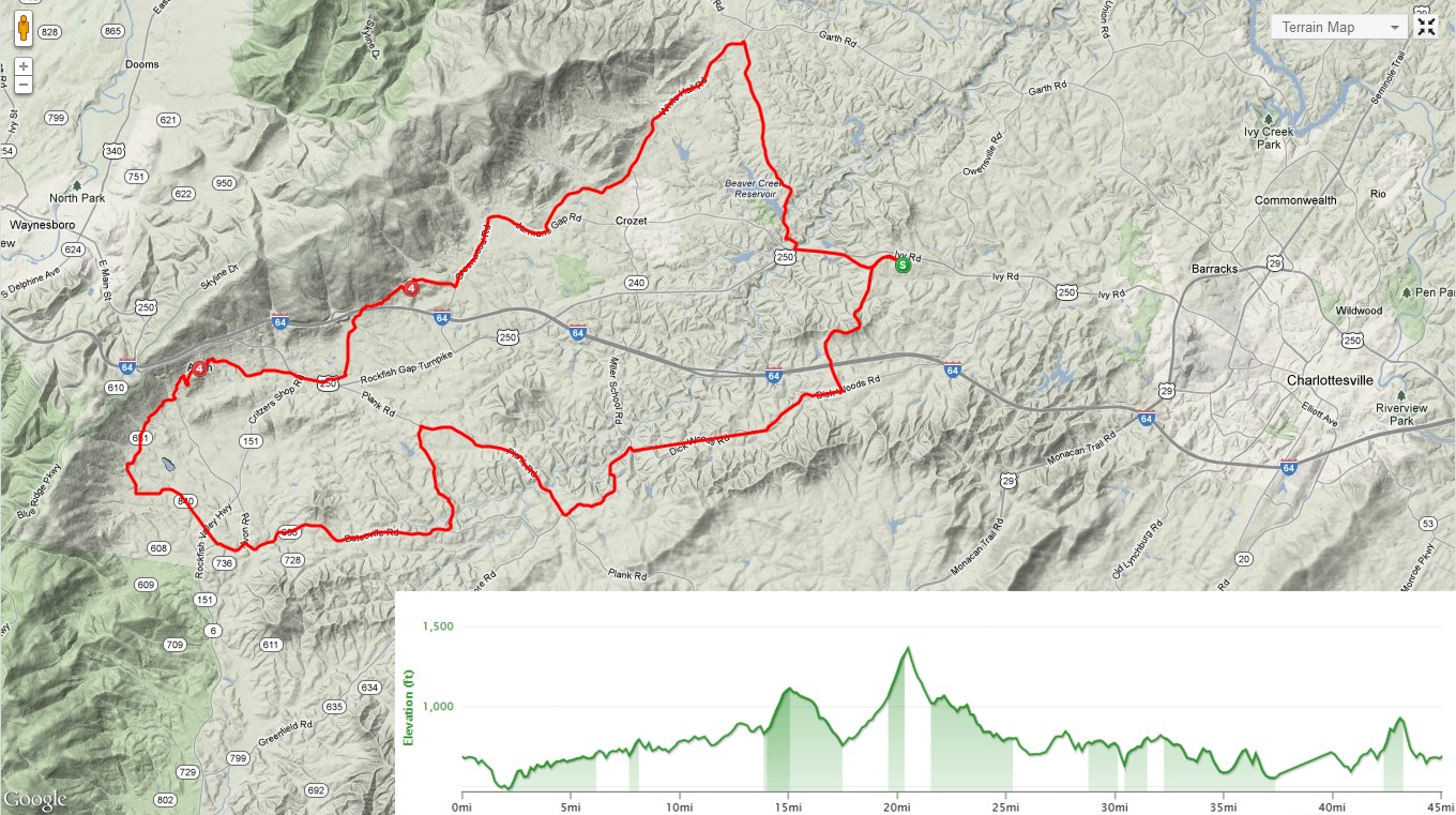 I took to the hills west of Charlottesville on Sunday. I rode with a group of ten for 45 miles. Okay, I’ll clarify: I departed on a ride with a group; but did most of the climbing alone! 😀 That was to be expected. My true purpose for being out there was to get a taste of what I might experience on a much longer ride with a lot more climbing. The steepest hill I climbed was 15%. UGH! Starting and regrouping with other riders made the ride more enjoyable than riding it alone. The 32T cog made a significant difference in my comfort level while climbing. Sure, it’s no triple. But it’s still a 14% reduction to the gearing I had before and very close to what I’d have with a 30×28 triple. The downhill stints were easily spun out beyond 32-mph. At that point, I just tucked and coasted. I think my 12-32T cassette brings a great compromise between hitting the hills and cruising in my flat stomping grounds of York County. Overall, I rode 45 miles, climbed 4000 feet and burned 3800 calories in 4 hours and 25 minutes. My rolling average was 12.6-mph with an overall average of 10.2. If I can maintain that level of intensity for an additional 205 miles (HA!), I may actually finish the Warrenton 400-km brevet with 2.5 hours to spare. That’s cutting it a little close, especially since I expect to slow as I tire. Time will tell.