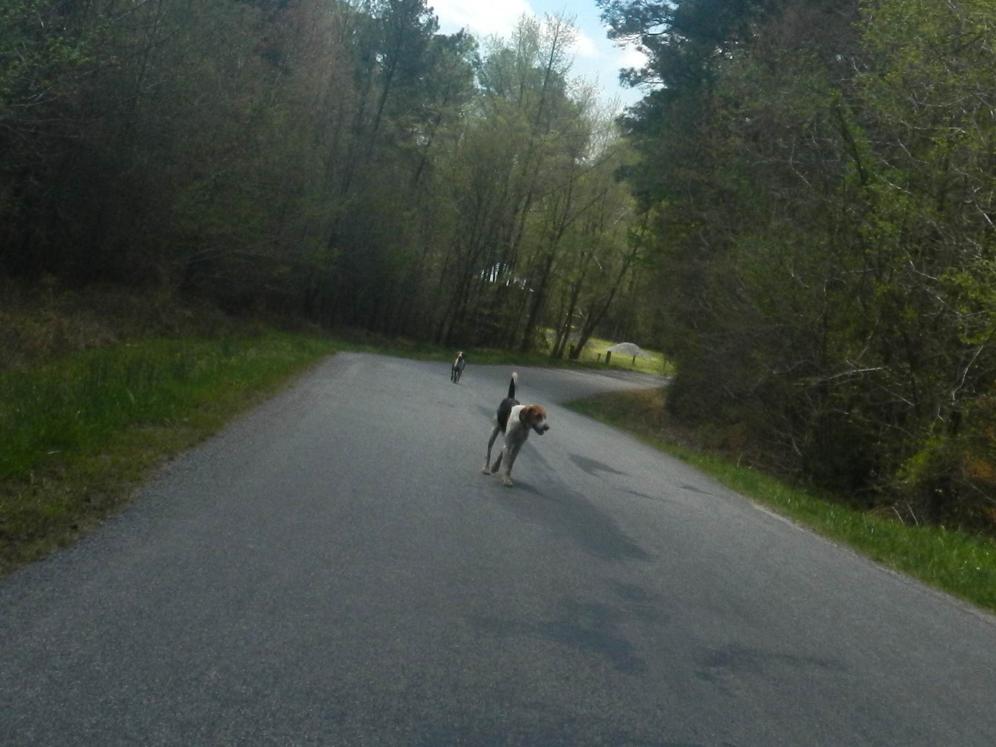 My average speed did drop as time passed. It was expected. I had overdone it early in the ride. That, combined with riding alone, meant that I was going to settle into a groove and roll with it. My rolling average was still 17-mph as I arrived at the second control point at 65 miles. My overall average was 15.5-mph due to my lengthy first control stop. I didn’t do better at this stop. I peeled off some clothing, applied sunscreen, and grabbed a PB&J lunch which was provided by fellow Tidewater Rando member Kim Aldridge. I also talked with her a few minutes. Okay… perhaps longer. 😉 My overall average dropped to 13.7-mph just by staying there so long. The photo above shows a couple of hunting dogs that were apparently wandering around while waiting to be found and picked up. We see this frequently in our area.