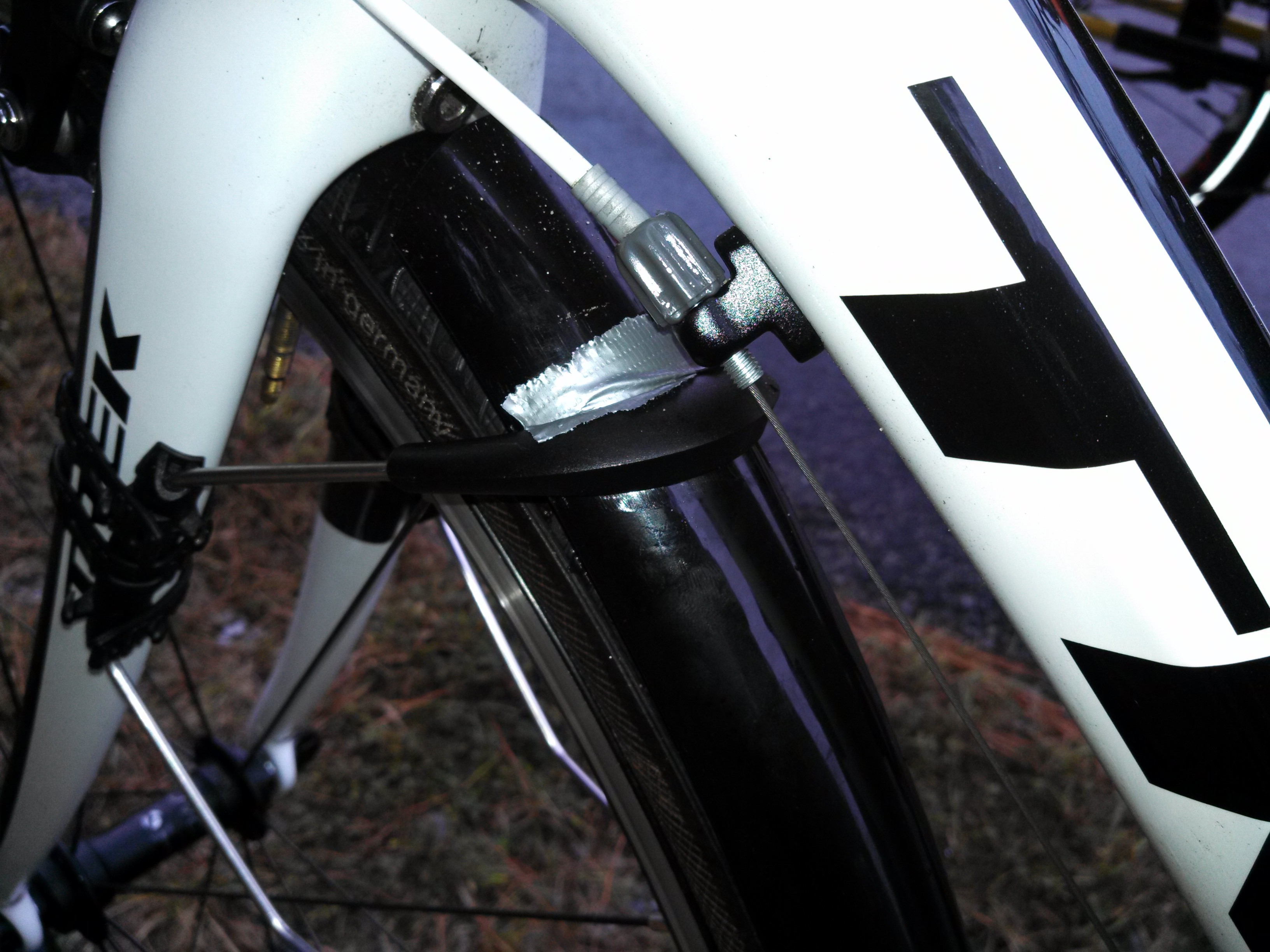 Today’s ride was the first of the cooler rides since April. It was 57 degrees at the start of the ride. I wore tights, a wool base layer, a short sleeve jersey and a vest. I also wore my reflective yellow vest and ankle bands since I was expecting bad weather. I was overdressed a tad because of the forecast and figured the extra layer would help keep me warm… and the wool to keep me dry. It eventually warmed up to 68 degrees. I removed the vest fairly early in the ride. I kept the base layer donned and was just a little warm. The wool was damp; but my skin felt great. I love my WOOL! On a different topic, I had just one nagging “mechanical” issue: fender alignment. This is the same ride during which I had fender issues earlier in the year. The more these fenders are adjusted the easier they slide. They weren’t staying put. I needed to fix them in place once they were aligned. I’m known for carrying just about any tool one would need. But Brent saved the day by having duct tape in his tool kit. I needed just a little to jam into the fender tabs. Here’s a photo of my temporary fix. 🙂