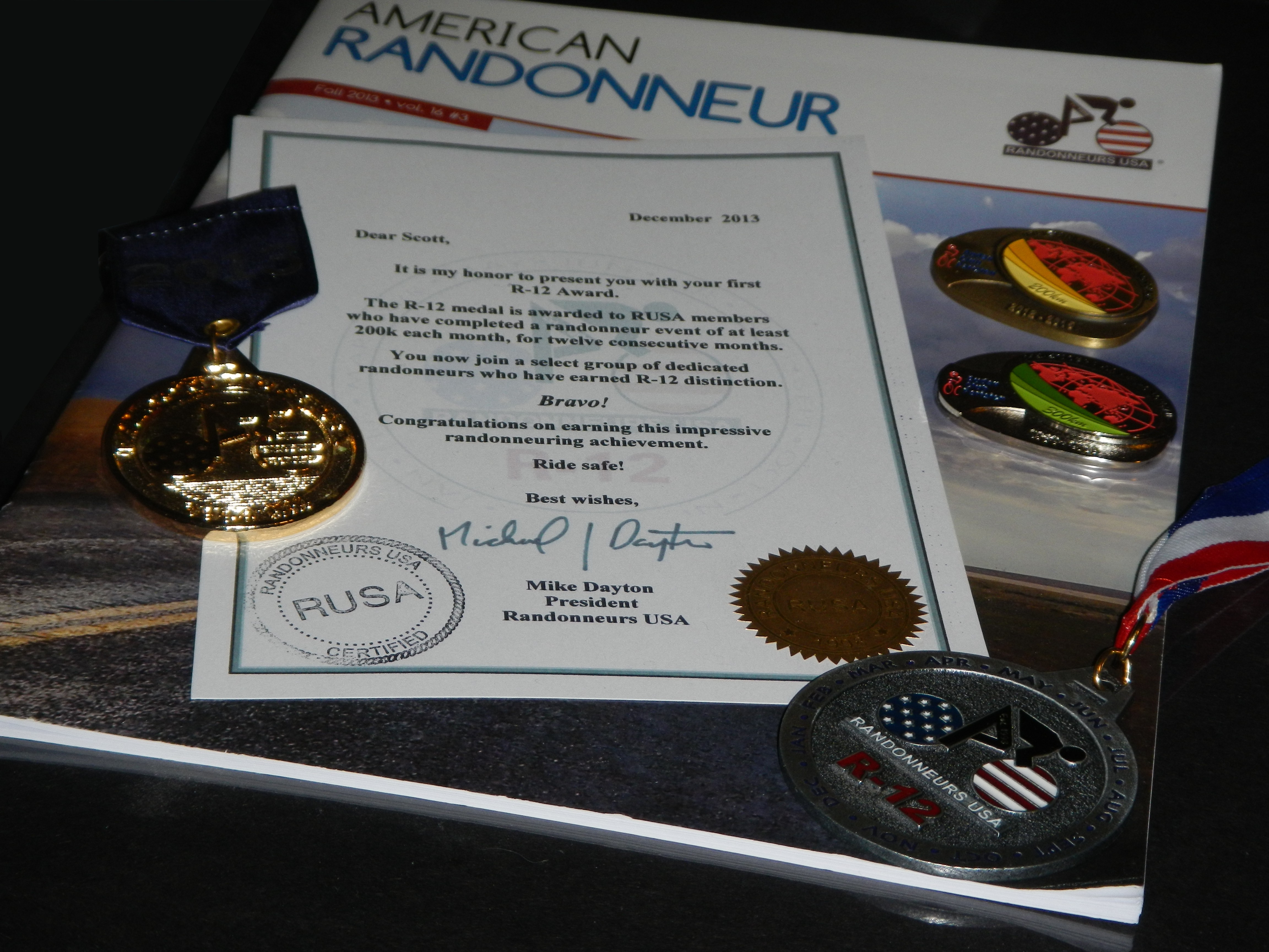 What are your cycling goals for 2014? I intend to chase a P12 goal and I want to complete an SR series. I started my P12 yesterday and was pleasantly surprised to find my R12 award and a letter from Mike Dayton in my mailbox when I returned. 🙂 I may complete another R12 during my training for the SR. But I don’t expect another R12 to be a primary goal. Depending on how I feel after a 600 km ride, I may even feel demented enough to try a 1200 km (750 mi) Grand Randonnee. We’ll see how that goes. Until then, I hope everyone had a great 2013 and is planning for an even better 2014!