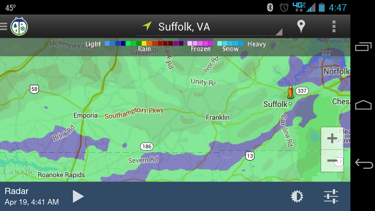 Screenshot_2014-04-19-04-47-50I rode my second run of the Suffolk-Lake Gaston 300 km on April 19th. It was the second ride in my planned pursuit of a Super Randonneur achievement. Since I had a decent finish last year (17h:15m), I was confident that I would be okay this year even though I wasn’t riding with the same strength just yet. The only downside to the morning was the weather. Here is a screenshot of the radar map when I awoke. Most cyclists, including me, don’t like to see a Saturday that looks like that. Regardless, I had already mounted my fenders and packed the rain gear to prepare for a long, wet ride. In addition to rain, it was 45 degrees and expected to warm to only 53 that day. I wore tights, a wool base layer, a balaclava, Gore Windstop gloves and my Gore raincoat. I also stretched a liner over my helmet. This was my attire for the vast majority of the day.