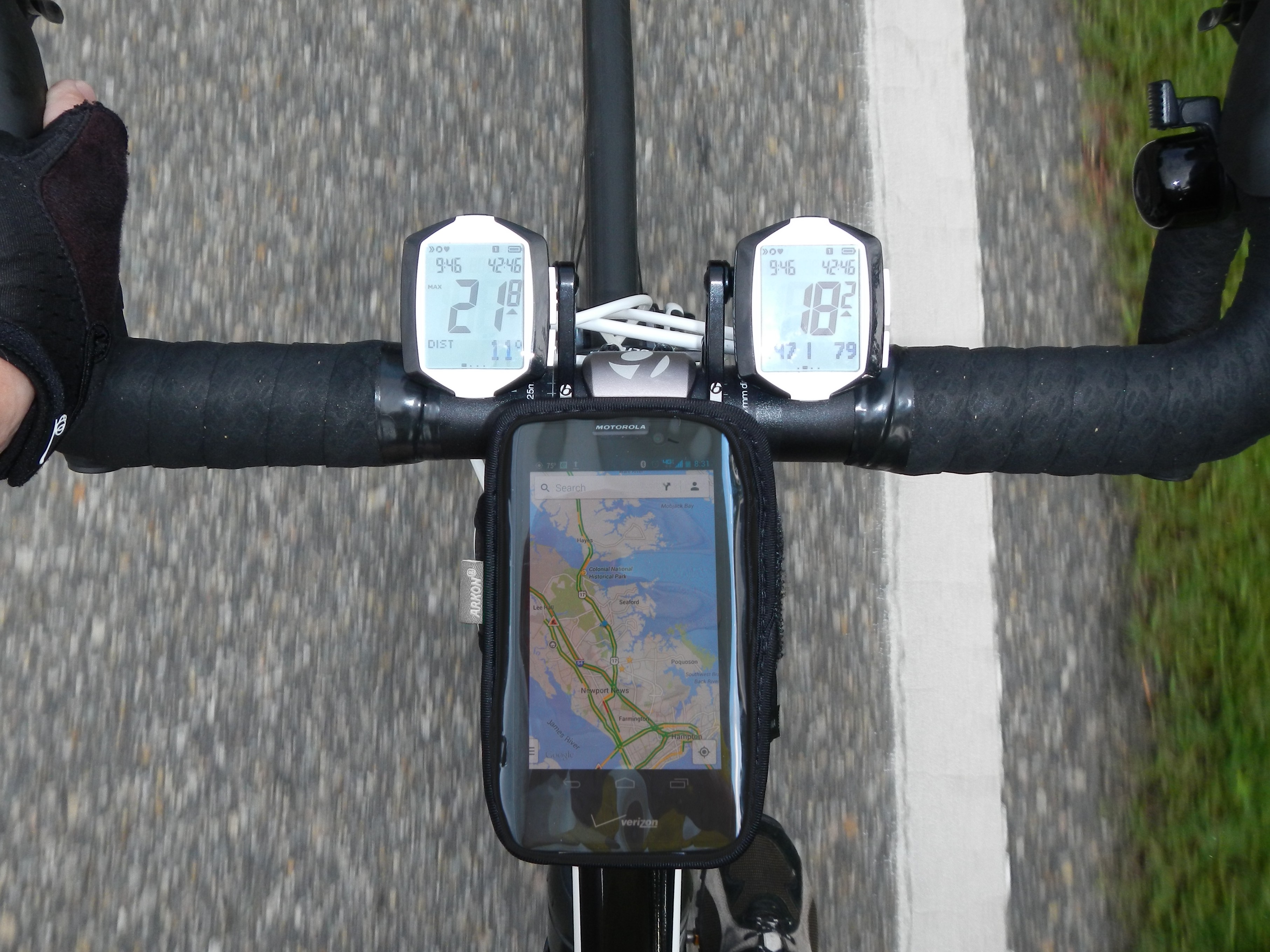 DuoTrapMy Node computers (photo above) cover almost everything I want to know. I mounted them on Bontrager computer mounts to keep them centered on the handlebars despite having bag mounts installed there. Both Nodes receive wireless speed and cadence signals from a single DuoTrap sensor in the frame (see photo) as well as my ANT+ heartrate monitor. I use a jogger’s arm band carrier to strap my smartphone to the stem and external battery. I use an Anker portable charger to extend battery life to ~30 hours while using GPS/apps on the road. I attach the battery to the bike using a Handy E-Pack with F66 Fixer.