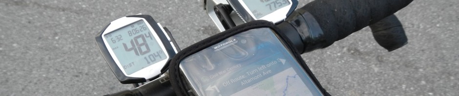 ComputerBars-DualOverheadI can’t count the number of times I’ve been asked, “What’s that stuff on your handlebars?” I’ve been a tech-weenie for over 30 years. I’ve considered navigation units, fancy cyclocomputers and other gadgets. I already keep my smartphone charged and with me. Therefore, I’m reluctant to carry more electronics that I must mount to the bike, learn to use, remember to keep charged and recharge during long rides. Instead, I opted to make the best of my smartphone with Andriod apps. This photo shows the smartphone strapped to the stem over top of an external battery pack. Here are details about my equipment: